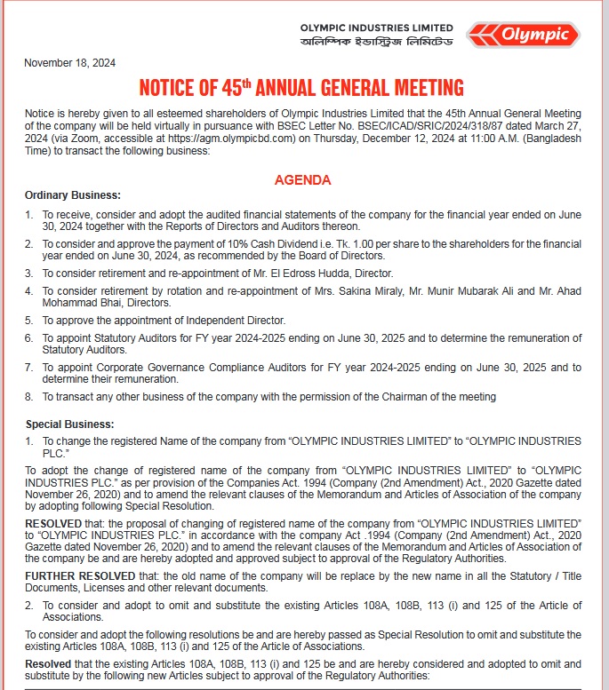 শেয়ারবাজারে তালিকাভুক্ত অলিম্পিক ইন্ডাস্ট্রিজ লিমিটেড এর বার্ষিক সাধারন সভা গত(জুমের মাধ্যমে) বৃহস্পতিবার, ১২ডিসেম্বর, ২০২৪ সকাল ১১:০০ অনুষ্ঠিত হয়। সভায় ৩০ জুন, ২০২৪ সমাপ্ত অর্থবছরের জন্য বোর্ড অফ ডিরেক্টরের সুপারিশ অনুসারে ১০ শতাংশ ক্যাশ ডিভিডেন্ড ঘোষণা করা হয়। কোম্পানি সূত্রে এই তথ্য জানা গেছে।